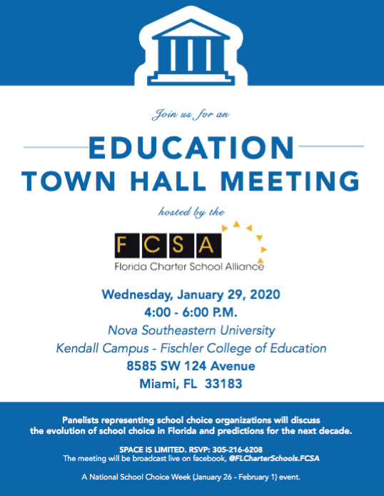 Florida – January 17, 2020 – The Florida Charter School Alliance (FCSA) will host a series of education town hall meetings around the state this year. The first meetings will take place in Miami on January 29 – to coincide with National School Choice Week – and will feature a variety of educators, parents, business leaders, and advocates who will discuss the evolution of school choice in Florida and predictions for the next decade. The meetings are open to the public and will be broadcast live on Facebook.
