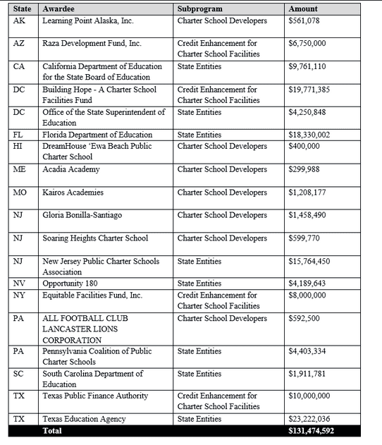 As with all the Department of Education’s discretionary grant competitions, applications for CSP funding were evaluated by a panel of independent peer reviewers, and only the highest-scoring applications received funding. To learn more about public charter schools, please visit https://oese.ed.gov/offices/office-of-discretionary-grants-support-services/charter-school-programs/.